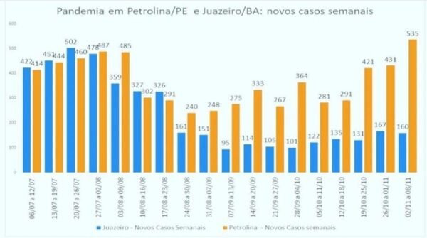 Petrolina fecha a semana com um recorde no número de novos casos de Covid-19, um total de 535. O pico da pandemia, até então, era o período entre 27/07 a 02/08 com 487 novos casos e a semana seguinte, entre 03/08 a 09/08 com 485 novos casos.