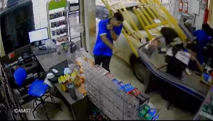 Em um pulo dado no susto, o funcionário se agarra em um caixa que fica à esquerda da loja e escapa de ser atingido. Segundos depois ele se junta aos colegas. O jovem não se feriu, mas outros dois atendentes, um homem e uma mulher, tiveram ferimentos leves.
