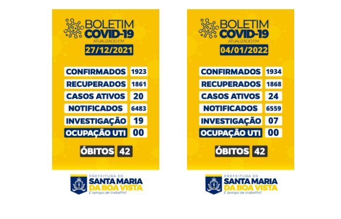 Quinze dias depois, Santa Maria da Boa Vista registra 107 pessoas infectadas com a doença e doze casos em investigação. No dia 04 de janeiro, primeiro boletim do ano no município, eram 24 casos ativos, ou seja, a fatura dos exageros do réveillon está começando a chegar na cidade. Até o início da pandemia, 42 pessoas foram a óbito.