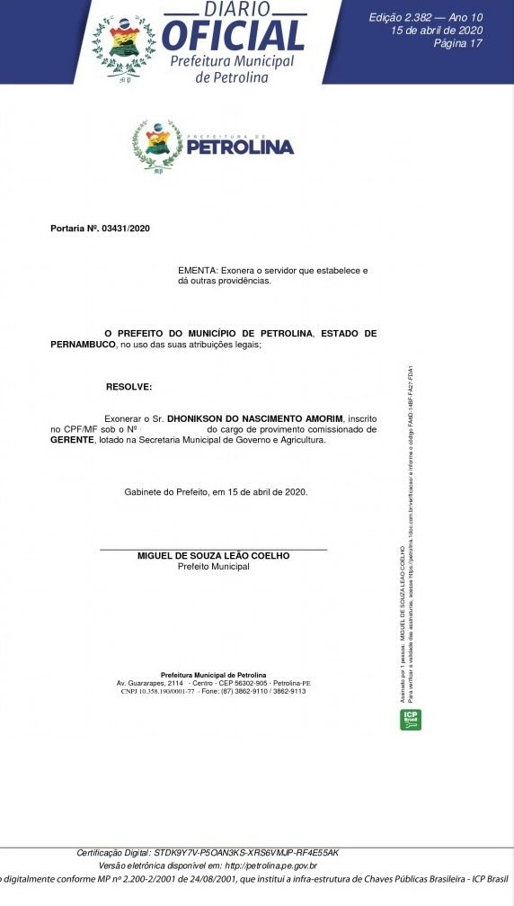 O ex-prefeito de Lagoa Grande Dhonikson do Nascimento Amorim (PSB) foi exonerado do cargo comissionado de Gerente que ocupava na secretaria de Governo e Agricultura da prefeitura de Petrolina. Sua portaria de exoneração foi assinada nesta quarta-feira (15) de abril pelo prefeito Miguel Coelho (MDB). Coincidência ou não, a exoneração de Dhoni ocorre dias depois do mesmo oficializar seu apoio ao então prefeito Vilmar Cappellaro.