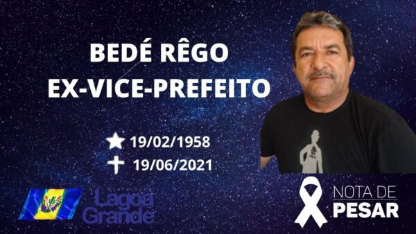 Em nome da Prefeitura Municipal de Lagoa Grande, o prefeito Vilmar Cappellaro e a vice-prefeita, Catharina Garziera, se solidarizam com a família e amigos e manifestam o mais profundo pesar pelo falecimento do ex-vice-prefeito, Manoel da Silva Rêgo, popularmente conhecido por Bedé Rêgo, 63 anos, ocorrido na manhã deste sábado, 19, e decreta luto oficial de três dias.