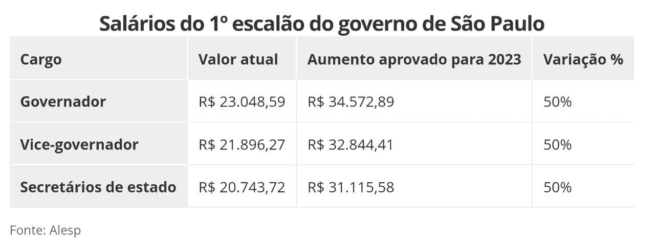 Já o salário do vice, Felício Ramuth (PSD), passará de R$ 21.896,27 para R$ 32.844,41, e o dos secretários estaduais, de R$ 20.743,72 para R$ 31.115,58