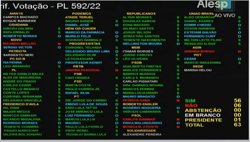 Do total de parlamentares presentes, 56 votaram sim, e seis foram contrários. A bancada do PT tem 10 parlamentares. A do PL, que elegeu 10 deputados em 2018, hoje tem 17, e a do Republicanos, partido do governador eleito, Tarcísio de Freitas, 8.