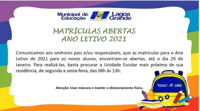A Secretaria de Educação (Seduc) de Lagoa Grande segue com o período de matrículas presencias para o ano letivo 2021 dos alunos novatos. As inscrições vão até o dia 29 de janeiro, na unidade escolar mais próxima de sua residência. O período será de segunda a sexta, das 8h até as 13h. A pasta ainda não divulgou a data do início do ano letivo.