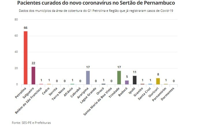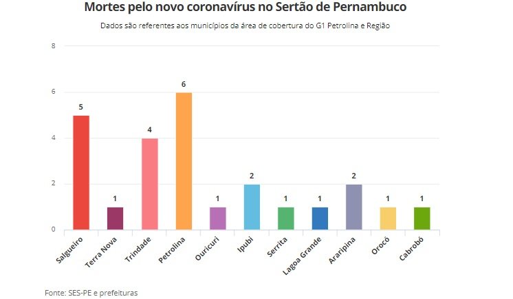 Na área de cobertura do portal G1 Petrolina e Região, são 25 óbitos. O município de Ipubi, confirmou nesta quinta-feira (21) o segundo óbito causado pelo novo coronavírus. Em Salgueiro, um sargento da Polícia Militar morreu de coronavírus aos 51 anos de idade. Desta forma, Petrolina lidera o número de casos, com seis. Depois, Salgueiro com 5 mortes e Trindade com quatro e Ipubi com duas. As outras foram registradas em Araripina, Lagoa Grande, Terra Nova, Ouricuri,Serrita, Orocó e Cabrobó.
