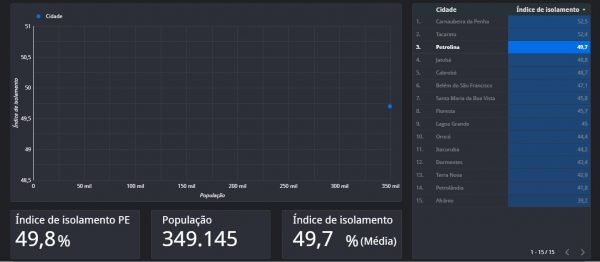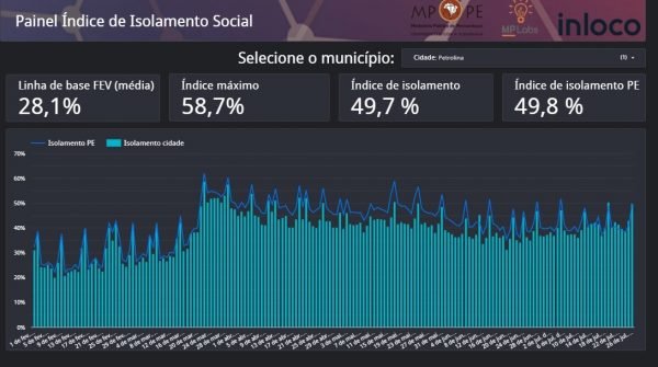 Mesmo com o fechamento do comércio não essencial em Petrolina, o índice de isolamento alcançou a média de 49,7% até o domingo (26). A porcentagem é curiosamente menor a atingida no último sábado (25), quando 42,9% da população manteve-se em casa. As informações foram obtidas através do Painel de Isolamento Social do Ministério Público de Pernambuco (só clicar aqui)