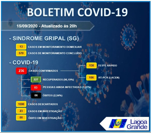Hoje, dia 15 de setembro os números foram os seguintes: 236 confirmados e 227 recuperados, tirando os 6 óbitos, a porcentagem de curas é de 96,19%. Nesta data, o boletim apontou que o município possui apenas 3 pessoas infectadas. Com isso, nota-se uma redução nos casos positivados e um aumento extraordinário nas curas clínicas.