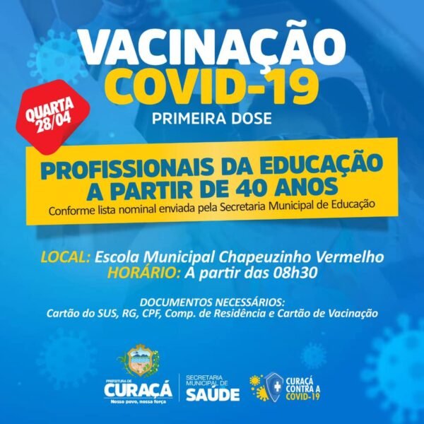 A Prefeitura de Curaçá na Bahia anunciou que vai dar inicio a vacinação para profissionais da Educação a partir de 40 anos. A aplicação acontecerá hoje (28), a partir das 8h30min na Escola Municipal Chapeuzinho Vermelho. O Blog do Everaldo entrou em contato com o secretário de educação Daniel Torres e o mesmo comemorou início da imunização na categoria. Torres disse que conforme lista nominal enviada pela Secretaria Municipal de Educação, serão 454 profissionais vacinados.