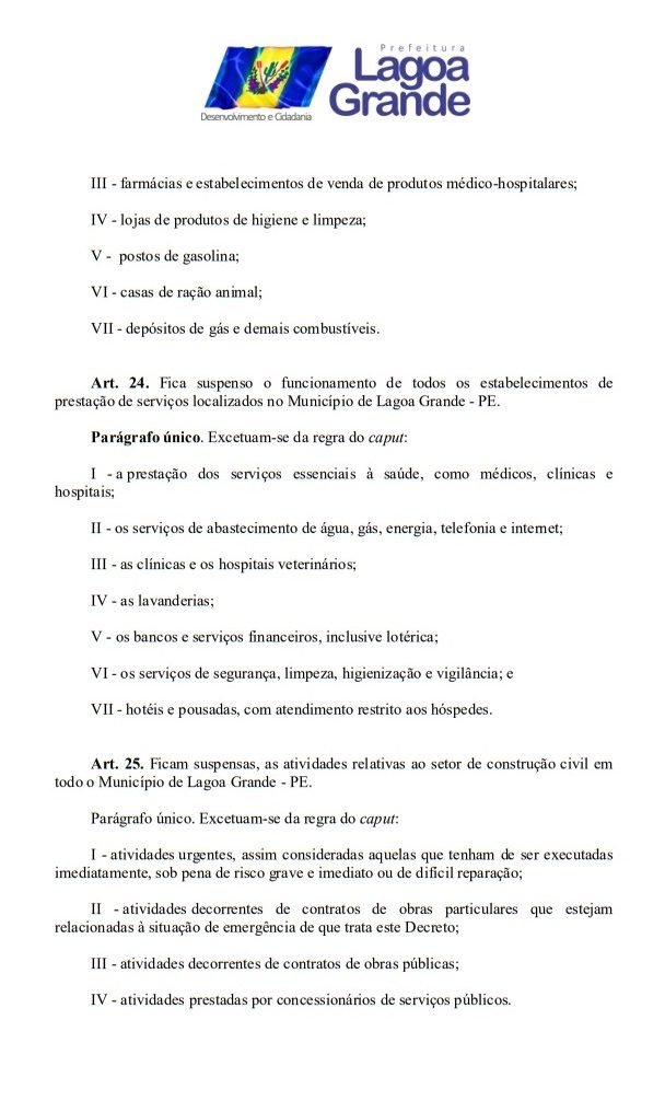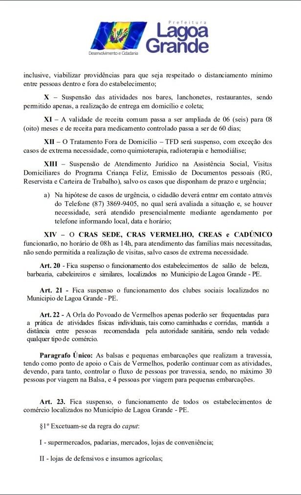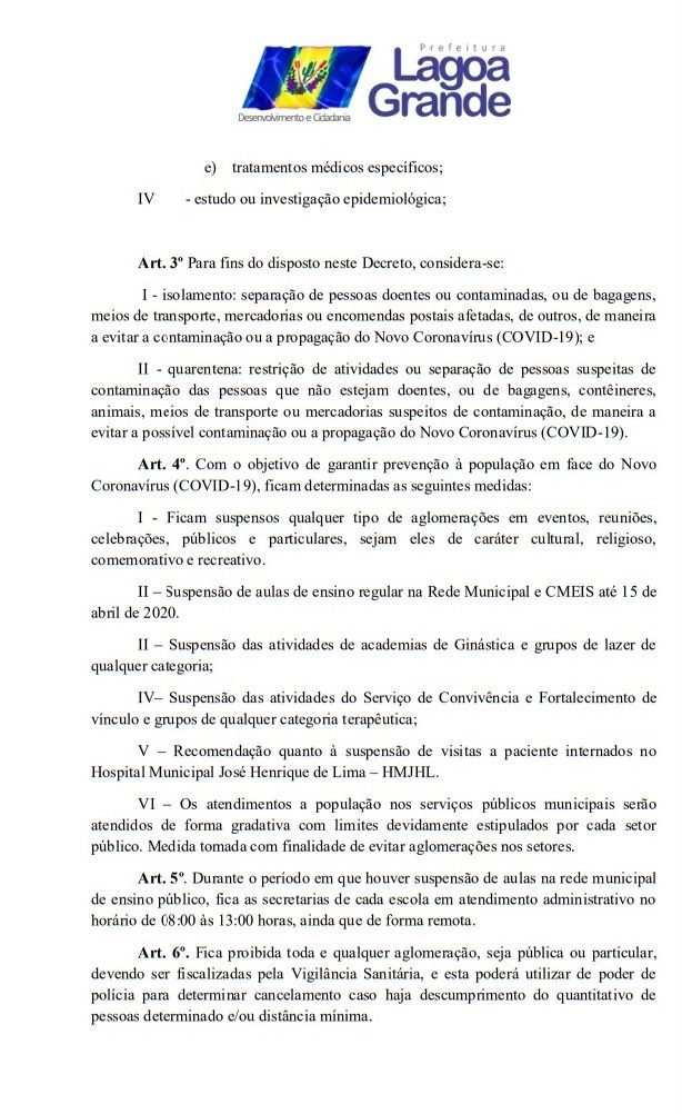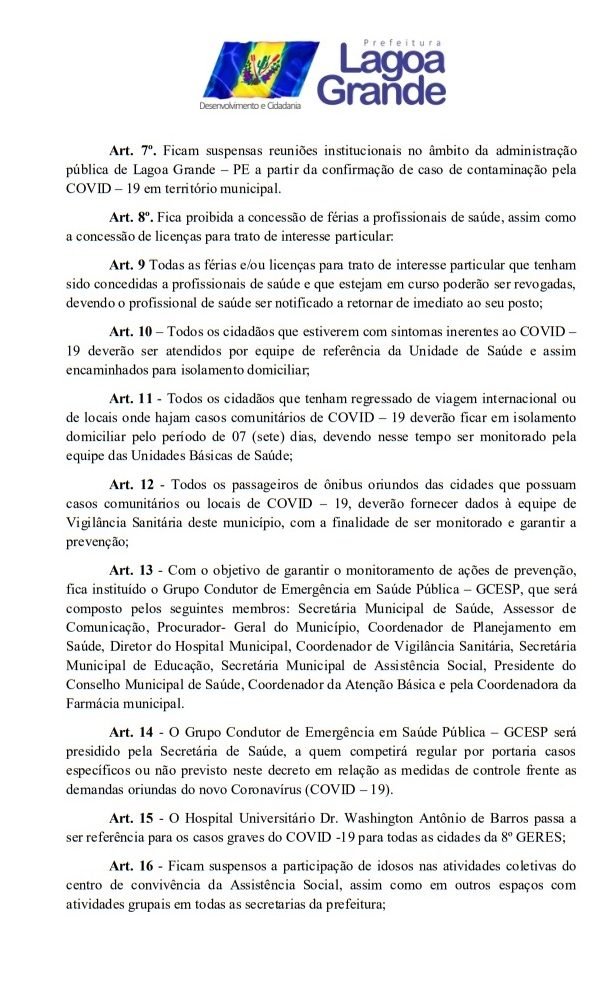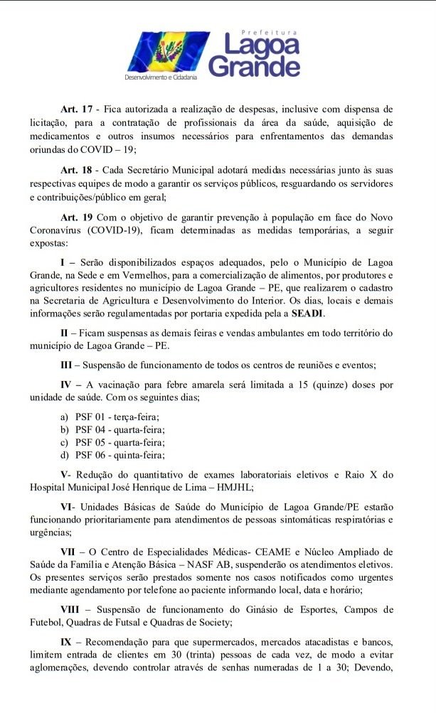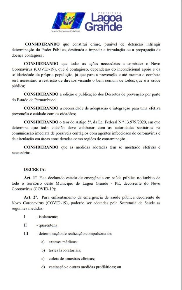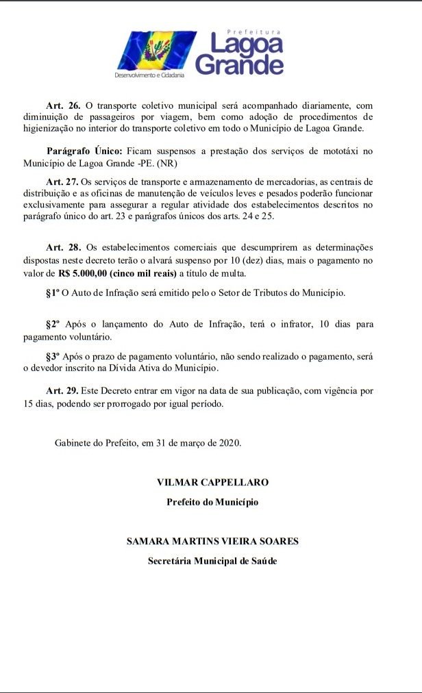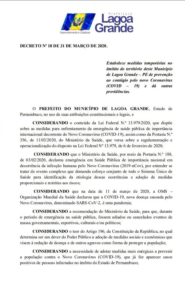 Todos os decretos já publicados pela Prefeitura de Lagoa Grande para suspender aglomerações e supender inumeros serviços teve seu prazo estendindo por mais 15 dias, ou seja, até o 15 de abril. A informação saiu na tarde desta terça-feira (31). O Prefeito Vilmar Cappellaro, assinou o DECRETO Nº 18 de 31 de março de 2020, onde fica declarado estado de emergência em saúde pública no âmbito de todo o território deste Município de Lagoa Grande – PE, decorrente do Novo Coronavírus (COVID-19). Veja todas as medidas temporarias no decreto abaixo.