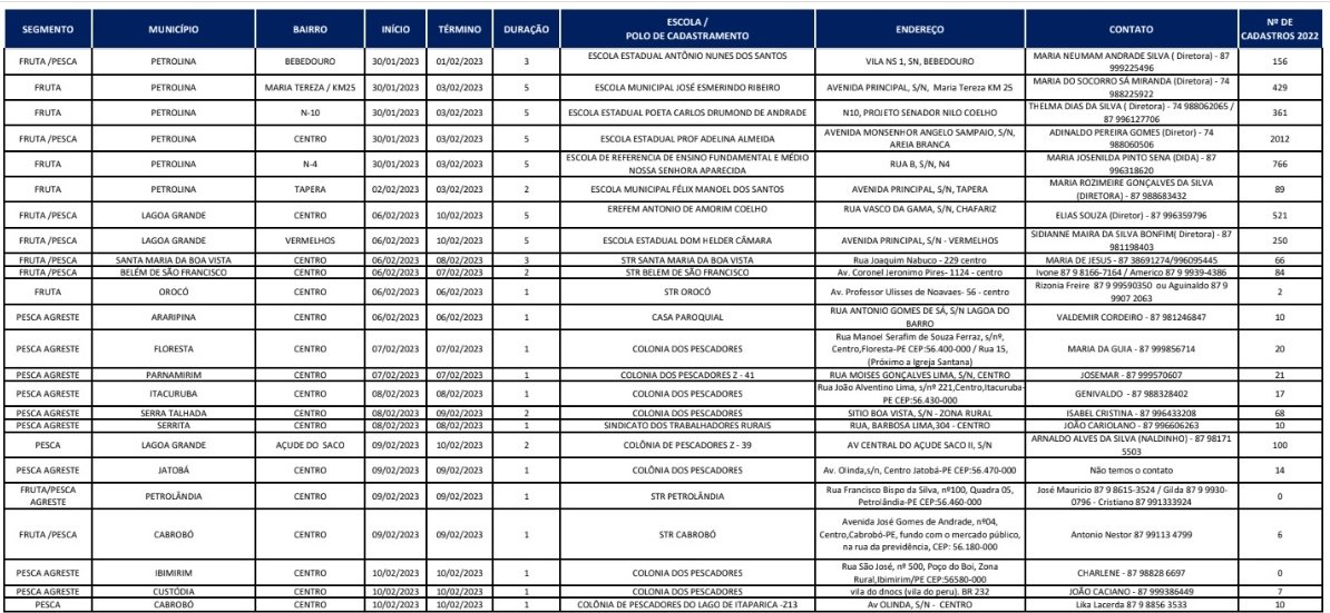 Confira abaixo os locais de cadastramento em Lagoa Grande, que funcionarão entre os dias 06 a 10 de fevereiro, das 8h às 17h para Fruticultura e Pesca. Cronograma completo e os critérios no final da matéria