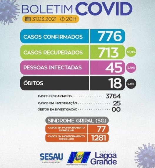A Secretaria de Saúde de Lagoa Grande informa que nesta quarta-feira (31), o município registrou seis novos casos da Covid-19. Atualmente, 45 pessoas estão em recuperação domiciliar. Destacamos que no mesmo período, nenhum óbito foi registrado.
