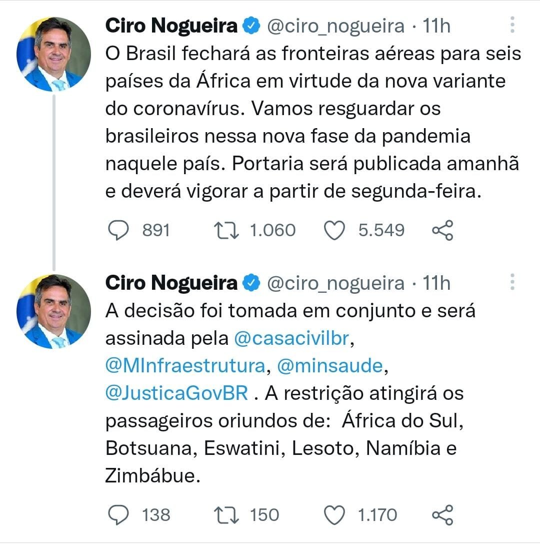 O Brasil vai fechar as fronteiras aéreas para passageiros vindos de seis países do Sul da África a partir da próxima segunda-feira (29), informou nesta sexta (26) o ministro chefe da Casa Civil, Ciro Nogueira.