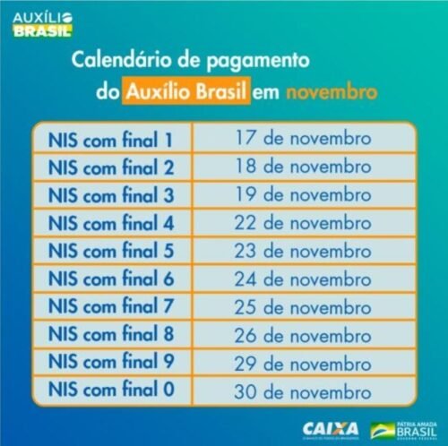 O Auxílio Brasil começará a ser pago no dia 17 de novembro, iniciando com os beneficiários que tenham NIS com final 1. As datas de pagamento para os beneficiários obedecerão ao seguinte calendário: