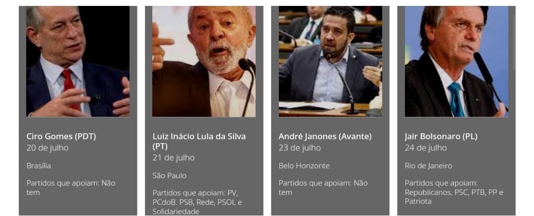 É nesses eventos que as legendas definem os nomes que vão concorrer a um dos cinco cargos em disputa em 2022: Deputado estadual (distrital no Distrito Federal); Deputado federal; Senador; Governador; Presidente da República (veja quem são os pré-candidatos). Veja, abaixo, o calendário completo de convenções e quem são os pré-candidatos