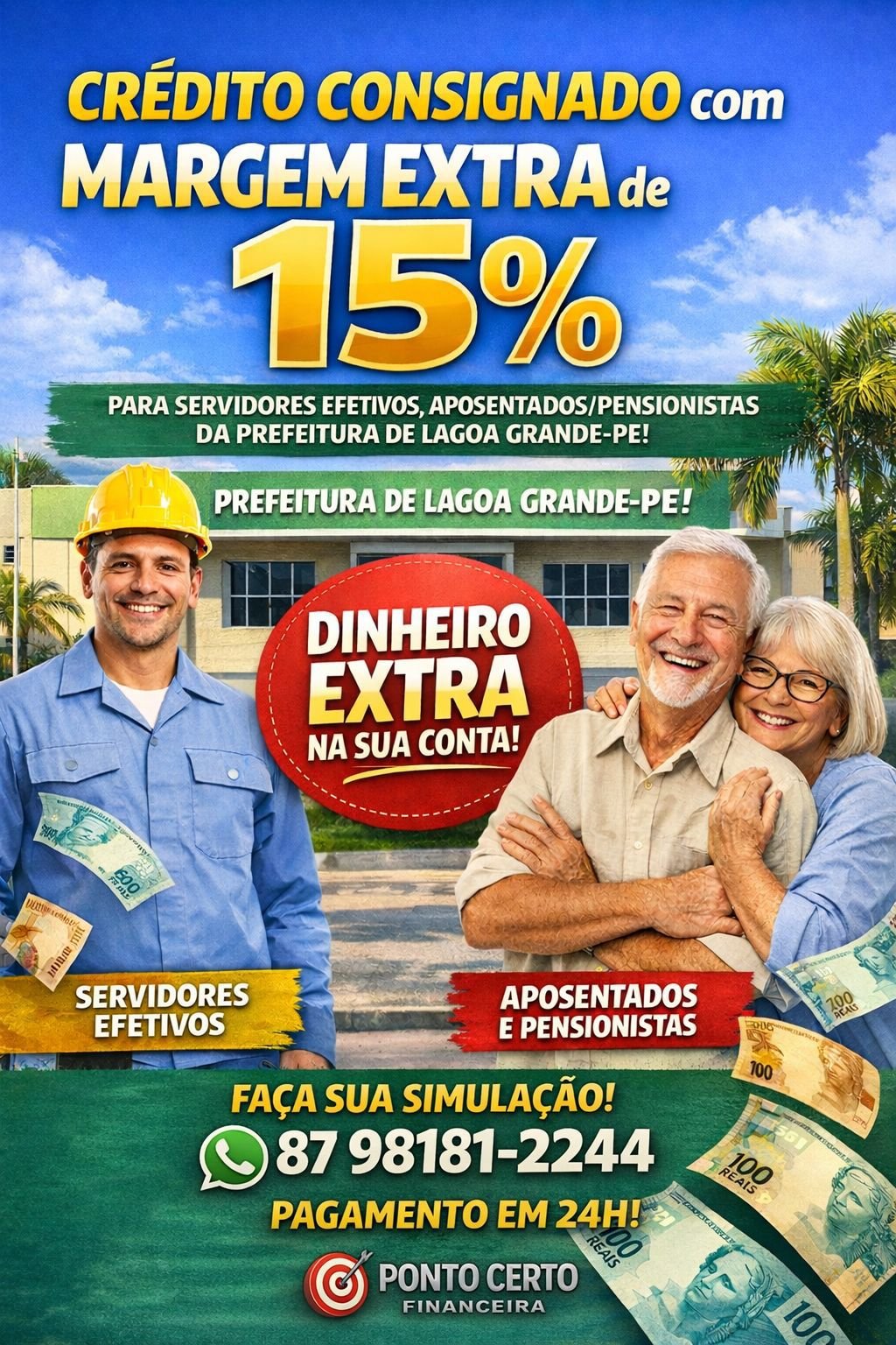 Os servidores públicos efetivos, os aposentados e os pensionistas poderão contar com dinheiro extra na conta. O crédito consignado com margem extra de 15% da Ponto Certo Financeira já é uma realidade em Lagoa Grande.