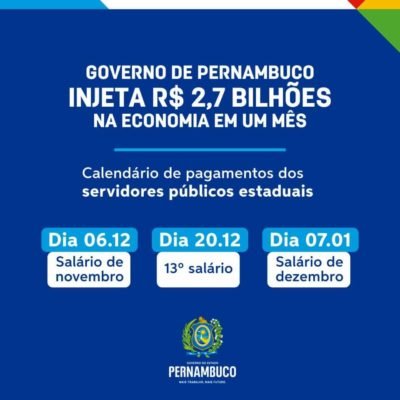 O governador Paulo Câmara anunciou, ontem, uma injeção de aproximadamente R$ 2,7 bilhões na economia pernambucana, no período de apenas um mês. Esse é o montante que o Governo do Estado vai aplicar no pagamento dos vencimentos de novembro e dezembro do funcionalismo estadual, além do 13º salário, que será pago no próximo dia 20 de dezembro. De acordo com o calendário divulgado nesta segunda, as folhas de pagamento dos meses de novembro e dezembro serão pagas nos dias 06 de dezembro e 07 de janeiro, respectivamente.  A medida trará mais robustez para o comércio local e para outros setores da economia do Estado.