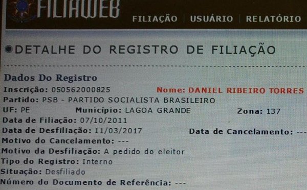Após quase 11 anos filiado ao Partido Socialista Brasileiro (PSB), o ex-secretário de educação de Lagoa Grande, Daniel Torres confirmou ao blog sua desfiliação ao partido no dia 11 de março. Torres disse ao blog do Everaldo: “Desde o mês de março dei baixa no TRE.” Além de secretário de educação, o mesmo foi candidato como vice-prefeito na chapa com o ex-prefeito Dhoni Amorim.