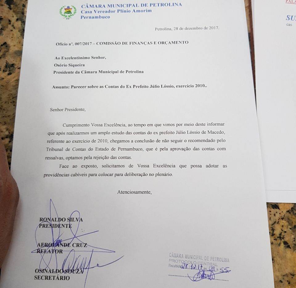 O documento diz que a Comissão chegou à conclusão de não seguir a recomendação do Tribunal de Contas do Estado (TCE-PE), que é pela aprovação das contas. A Comissão de Finanças é composta pelos vereadores Ronaldo Silva (presidente), Aero Cruz (relator) e Osinaldo Souza (secretário). Assinaram o documento Aero Cruz e Osinaldo Souza.