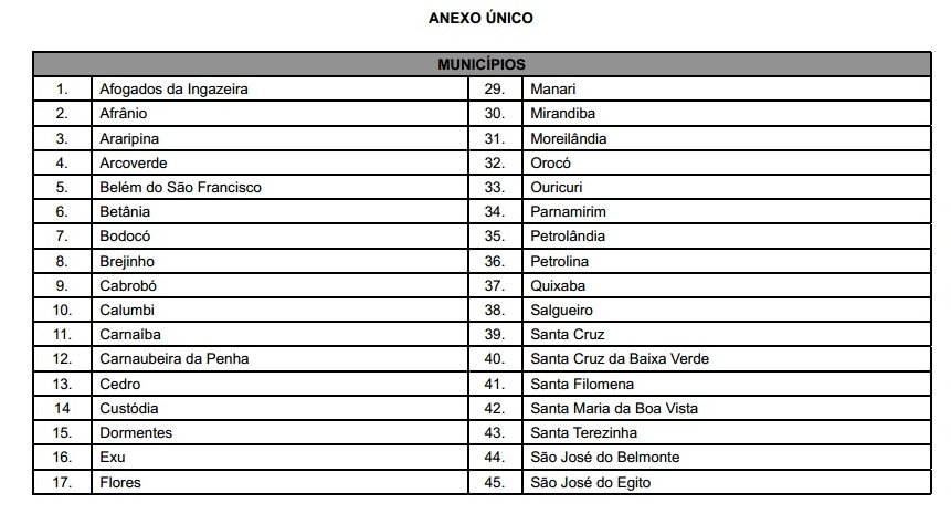 Governo de PE declara situação de emergência por 6 meses em Lagoa Grande e outros 55 municípios.
