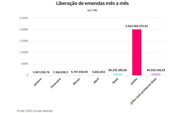 Nos seis primeiros dias de julho, segundo o levantamento da ONG, as emendas liberadas somaram R$ 94.526.548,82, mais do que em qualquer um dos cinco primeiros meses do ano.