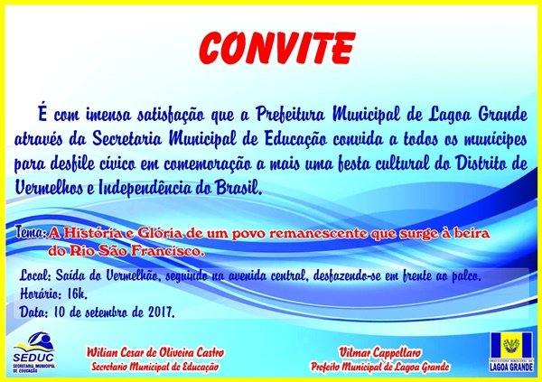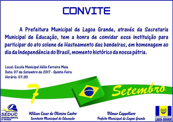 Secretaria de Educação de Lagoa Grande realizará Desfile Cívico no dia 10 nos Vermelhos e amanhã terá hasteamento das bandeiras na Escola Helio Ferreira Maia.