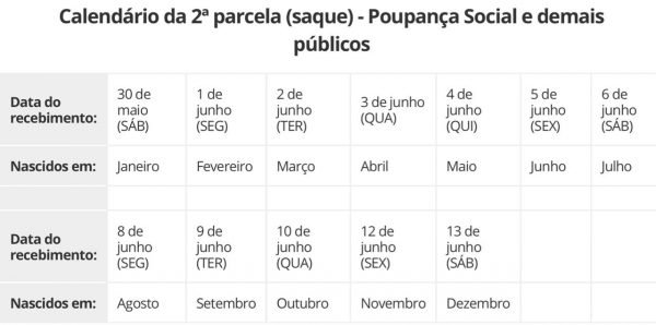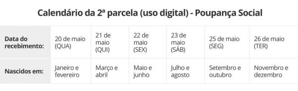 Segundo portaria sobre o calendário (veja mais abaixo), assinada pelo ministro Onyx Lorenzoni, quem recebeu a 1ª parcela até 30 de abril receberá o crédito da segunda parcela em poupança social digital a partir de quarta-feira (20), de acordo com a data de nascimento.