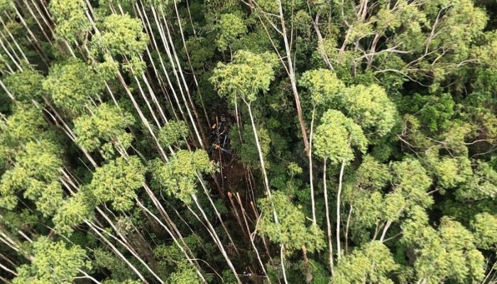 Na imagem divulgada pela Polícia Militar, é possível ver uma clareira entre a vegetação e o que seriam os destroços da aeronave entre as árvores.