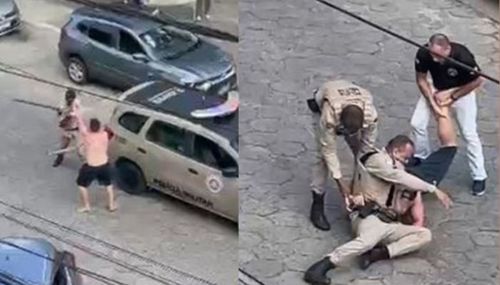 ➡️ Vídeos registrados por pessoas que estavam na região mostram o momento em que o homem agride os agentes com um pedaço de pau, e tenta tomar a arma de um deles;