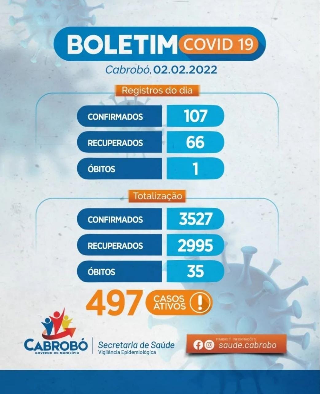 Os números oficiais da Covid-19 falam por si em Cabrobó. O Boletim divulgado pela prefeitura ontem (02) a noite registra 497 pessoas infectadas com a doença. Só no dia de ontem, o município registrou 107 novos casos da doença. A cidade registrou mais um óbito e o total chegou a 35 desde o início da pandemia.