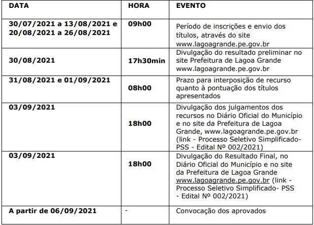 Com a nova alteração, as inscrições deverão ser feitas exclusivamente pela internet, no site www.lagoagrande.pe.gov.br até o dia 26 de agosto. A seleção será feita com base nos títulos dos candidatos, quando serão avaliadas e apreciadas também, as experiências profissionais dos candidatos na área de atuação pretendida. O envio dos títulos ocorrerá no supracitado site, no ato da inscrição. O resultado final está previsto para o dia 03 de setembro.