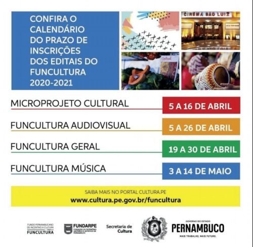 Estão abertas as inscrições para os editais da 14ª e 15ª edição do Funcultura do Audiovisual (2020-2021) e do 3º Funcultura Microprojeto Cultural (2020-2021), promovidos pela Secretaria Estadual de Cultura (Secult-PE) e a Fundação do Patrimônio Histórico e Artístico de Pernambuco (Fundarpe). Em ambos os casos, as inscrições devem ser realizadas por meio da plataforma on-line Prosas (www.cultura.pe.gov.br/editais-prosas).