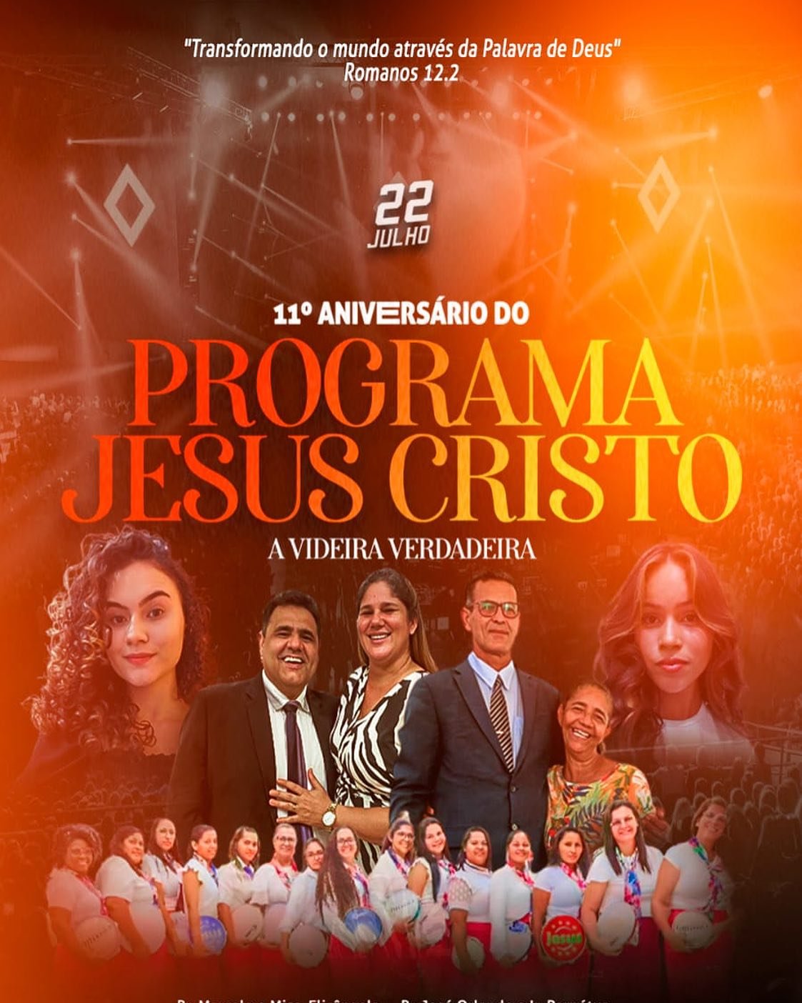 A Igreja Assembleia de Deus Ministério de Madureira realizará neste sábado (22) o culto de ação de graças em comemoração ao 11º aniversário do Programa Jesus Cristo a Videira Verdadeira em Lagoa Grande (PE). O evento tem o tema baseado em Romanos 12:2: “Transformando o mundo através da Palavra de Deus”.