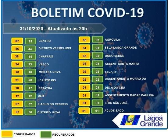 A Secretaria de Saúde de Lagoa Grande, no Sertão de Pernambuco registrou neste sábado (31), último dia do mês de outubro, a sexta morte pela Covid-19. O município agora possui 313 confirmações e 282 pessoas já estão recuperados. Ainda segundo o Boletim Covid-19, outras 25 pessoas continuam infectadas e 29 casos estão sendo investigados. Já Petrolina possui 7.142 casos da Covid-19, 5.273 recuperados e 106 mortes. O estado de Pernambuco totaliza 162.893 casos confirmados da doença e 144.875 pacientes recuperados da doença.