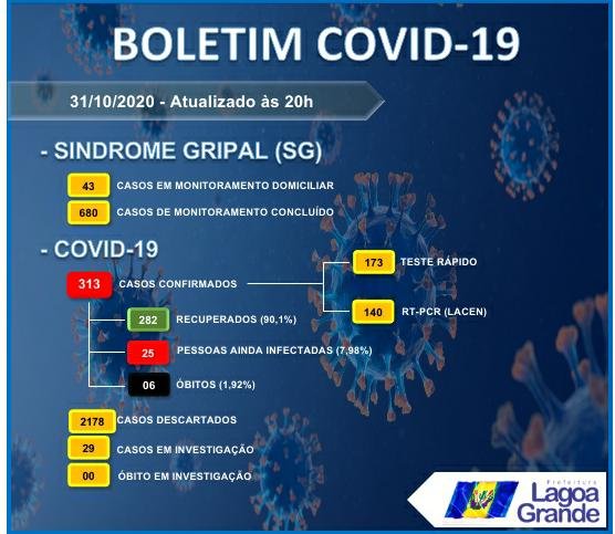 Lagoa Grande encerra outubro com 6 morte pela Covid-19, 313 casos confirmados e 282 curas