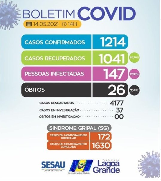 A Secretaria de Saúde de Lagoa Grande informa que nesta sexta-feira (14), o município registrou 12 novos casos da Covid-19. Atualmente, 147 pessoas estão em recuperação domiciliar. Destacamos que no mesmo período, um óbito foi registrado.
