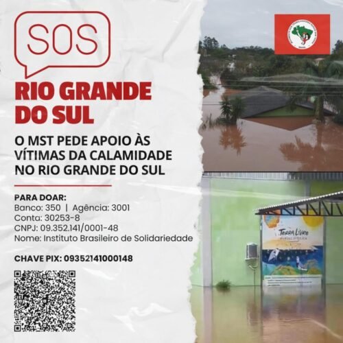 O Rio Grande do Sul vive uma calamidade pública nunca antes vista na sua história. Com perdas incalculáveis, ainda não é possível dimensionar o volume da catástrofe das águas que já deixou dezenas de mortes, isolamento de centenas de cidades, deslizamentos, quedas de barreiras e alagamentos nesta que já é considerada a maior enchente até hoje no estado. Com o objetivo de iniciar uma ampla campanha de solidariedade junto às famílias atingidas, o MST realiza um mutirão de arrecadação financeira para contribuir nas ações nos municípios gaúchos.