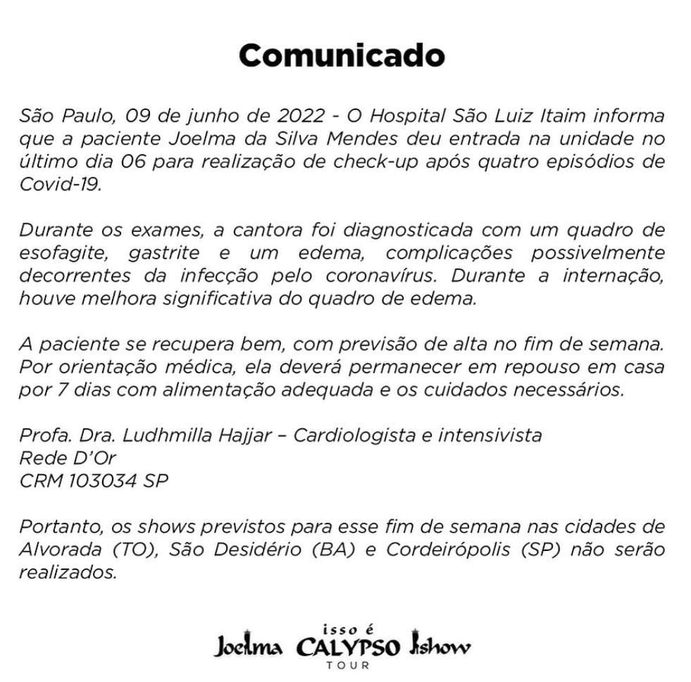 Nesta sexta-feira (10), Joelma está internada no Hospital São Luiz, em São Paulo. Ela foi hospitalizada na última segunda-feira (6) e foi diagnosticada com quadro de esofagite, gastrite e um edema, complicações que podem ter sido decorrentes da infecção pela Covid-19. Veja o comunicado logo abaixo