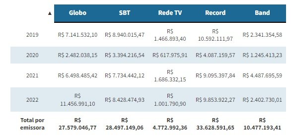 De 1º de janeiro a 21 de junho do ano passado, a Globo recebeu R$ 6,5 milhões em valores líquidos pagos por materiais publicitários de televisão veiculados em âmbito nacional e regional.