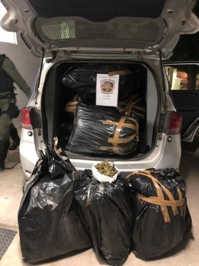 Segundo a polícia, foram encontrados nove sacos, contendo um total de 143,35 kg de maconha pronta para o consumo