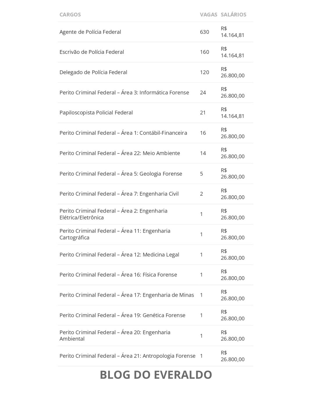 A remuneração inicial para os cargos de Delegado de Polícia Federal e Perito Criminal Federal, em todas as especialidades, é de R$ 26.800. Já os cargos de Escrivão, Agente e Papiloscopista contam com salário inicial de R$ 14.164,81.