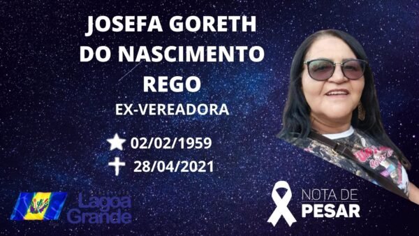 A Prefeitura de Lagoa Grande lamenta a morte da ex-vereadora, Josefa Goreth do Nascimento Rego, popularmente conhecida por Zefinha de Edson, nesta quarta-feira (28/04), por complicações da Covid-19. Zefinha exerceu o mandato na Câmara de Lagoa Grande na legislatura de 2009/2012, sempre defendendo os interesses da população