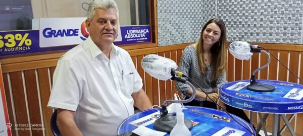 Prefeito Vilmar Cappellaro e a vice eleita Catharina Garziera destacam o desenvolvimento de Lagoa Grande em entrevistas nas rádios Grande Rio FM e AM