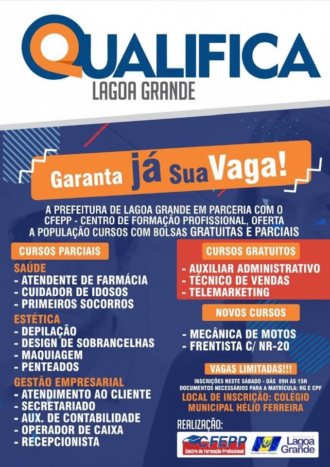Prefeitura de Lagoa Grande em parceria com o CFEPP oferta vários cursos grátis e bolsas parciais.