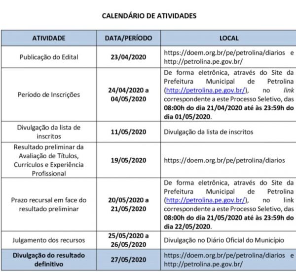 O processo seletivo será realizado em uma única etapa eliminatória e classificatória denominada avaliação curricular. As inscrições começam amanhã (24) e vão até o dia 05 de maio. O resultado definitivo sairá no dia 27 do mesmo mês. Para ter acesso ao edital, basta clicar aqui.