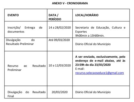 A seleção dos servidores será feita através de análise de experiência e analise de títulos. Os vencimentos variam de R$ 1.443,12 para professor com 100h e R$ 2.300,00 para o cargo de nutricionista. As inscrições (entrega da documentação), vão do dia 14 até o dia 28 de fevereiro, na sede da secretaria de Educação Cultura e Esporte de Petrolina. O resultado final está agendado para sair no dia 20 de março. Para ter acesso ao edital basta clica aqui.