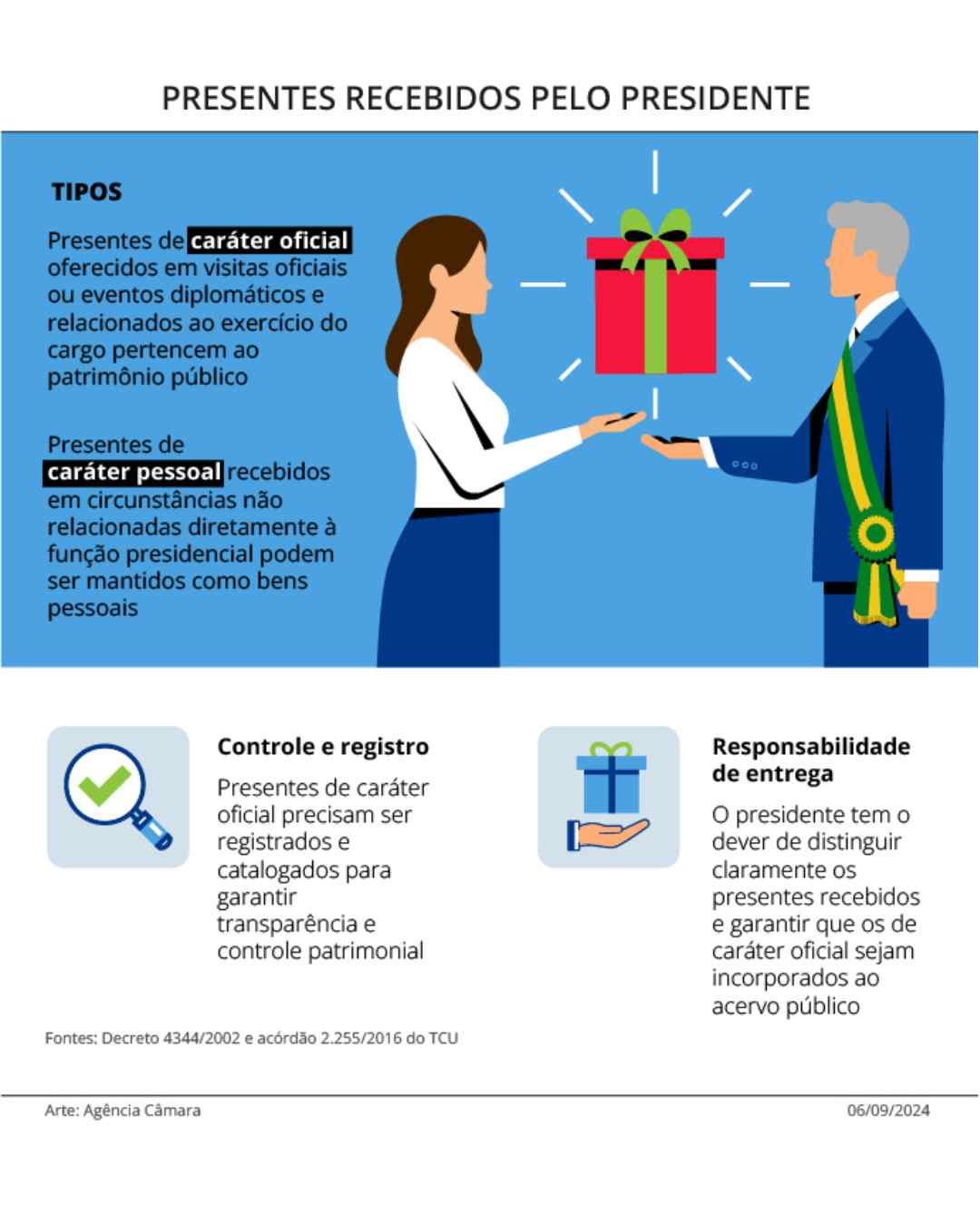 O Projeto de Lei 3146/24, do deputado José Medeiros (PL-MT), permite que o presidente e o vice-presidente da República fiquem com presentes recebidos. Conforme o projeto, “não configuram quaisquer ilícitos cível, penal, eleitoral e administrativo os presentes recebidos pelo presidente e vice-presidente da República, desde que o sejam em caráter personalíssimo, sendo necessária apenas e sua declaração perante a Receita Federal do Brasil para fins de recolhimento de tributos”.