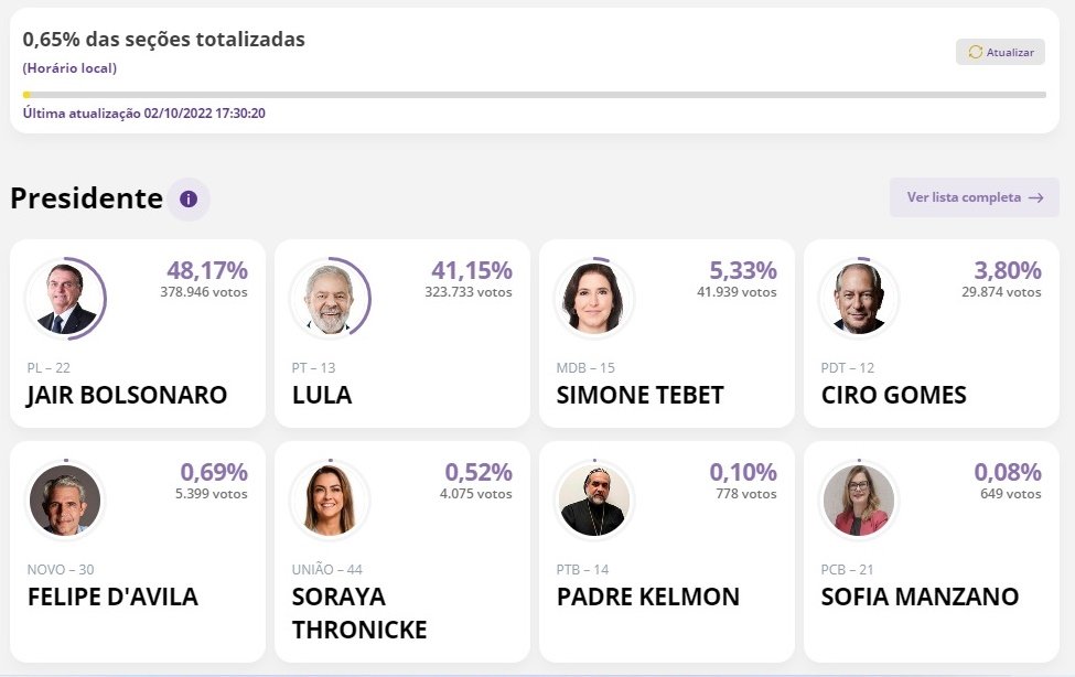 Resultado parcial: com 0,65% das seções totalizadas, Bolsonaro lidera disputa
