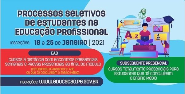 A Secretaria de Educação e Esportes de Pernambuco, através da Secretaria Executiva de Educação Integral e Profissional (SEIPE), abriu nesta segunda-feira (18) as inscrições para 15.095 vagas de cursos técnicos integrados ao ensino médio. Dessas, 7.190 vagas são para o Ensino à Distância (EAD) semipresencial e 7.905 vagas na forma subsequente presencial, voltadas para quem já terminou o ensino médio. As inscrições seguem até o dia 25 de janeiro e podem ser realizadas, gratuitamente, neste link. Serão ofertados 35 cursos em 76 escolas de 58 municípios do Sertão, Agreste, Zona da Mata e Região Metropolitana. Confira aqui os editais.