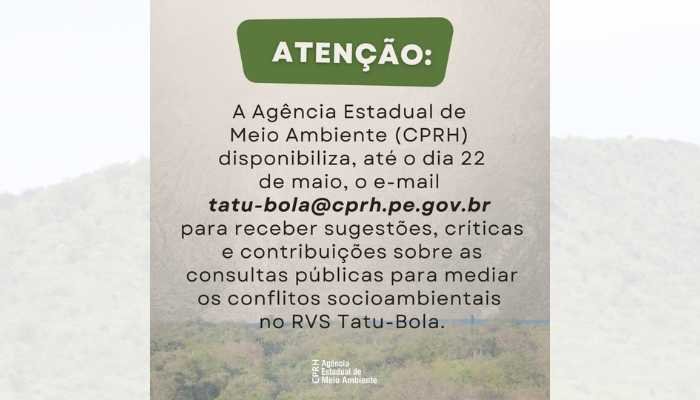 Essa fase segue até o dia 20 de maio e o interessado pode enviar através do e-mail: tatu-bola@cprh.pe.gov.br.