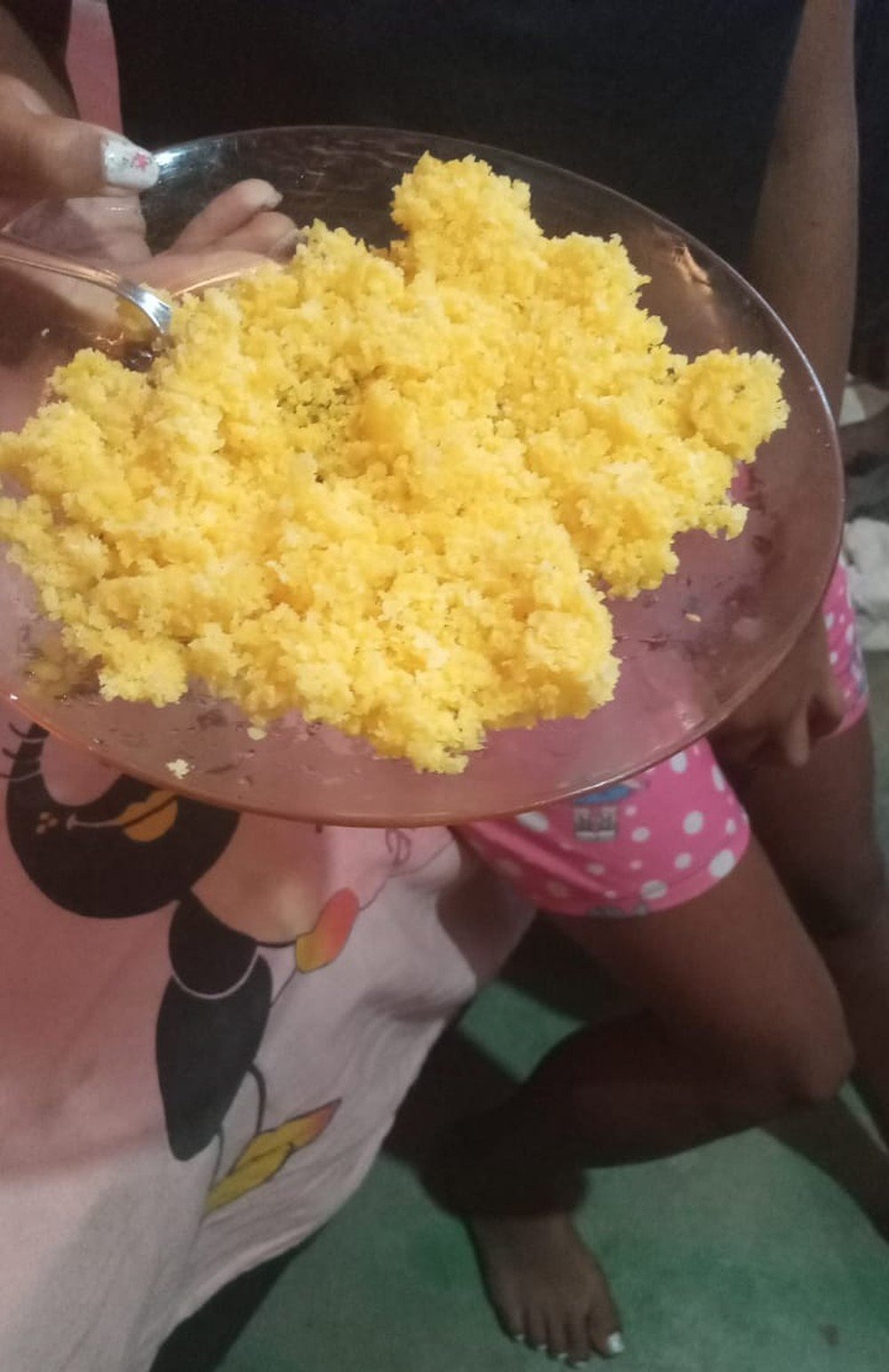 Na sexta-feira, 22 de julho, a família contou com a cesta básica entregue durante uma ação social na comunidade. De manhã, as duas crianças e os três adultos tomaram café preto e comeram cuscuz.